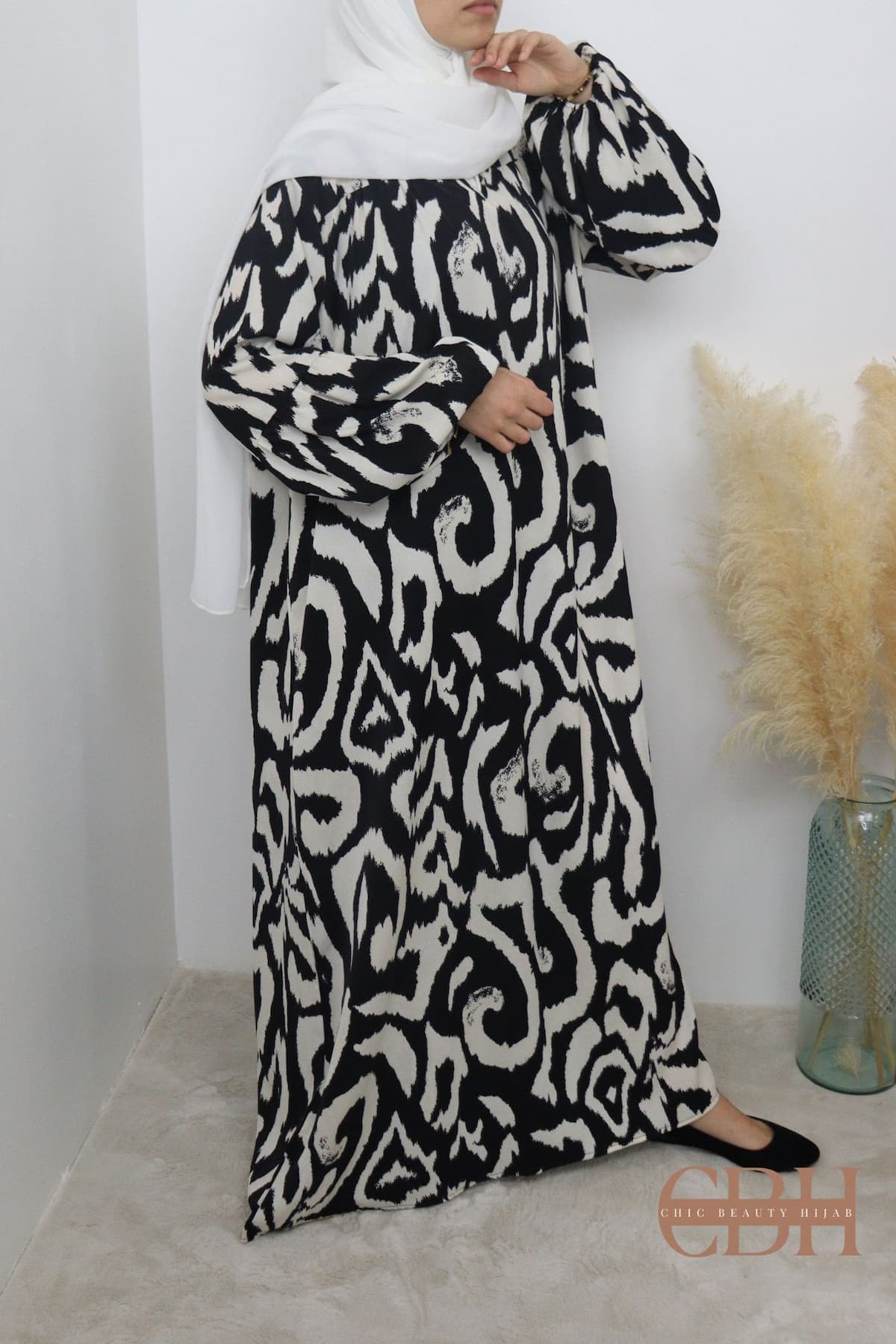 Modestie et Élégance : Cette robe longue imprimé AZRA noire est conçue pour répondre aux besoins des femmes musulmanes en matière de modestie et de style. Sa coupe ample et ses manches longues offrent une couverture modeste tout en préservant une allure chic et moderne.